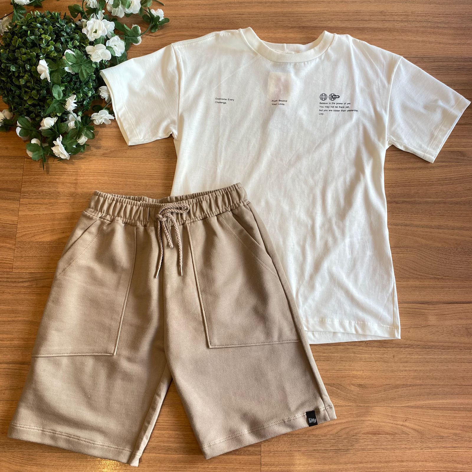 Estilo e conforto para os adolescentes! Esse conjunto da Livy combina camisa básica off-white com estampa minimalista e bermuda bege com bolsos frontais, trazendo um visual moderno e prático para o dia a dia.